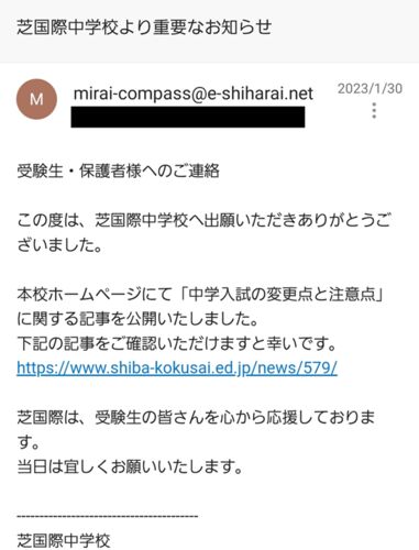 埼玉受験終了後、想像よりも長く感じた息子自宅待機の日々を過ごし、日能研の壮行会も終了、いよいよ決戦の日が近づいてきた1月末、 芝国際から謎のメールが。